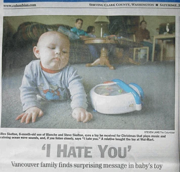 from late 2002 to mid-2003 there was a toy colled the kid connection crib aquarium sold in walmart stores in the US and Canada in mid-2003 it was recalled because the toy's audio was sounding like a woman/child is whispering i hate you (and because the parents didn't want their child to hear those words),the only proof of the toy are images and a canadian newspaper headline and a screenshot of a news report,the toy was immidietaly pulled off the shelves and the toy was a knockoff of fisher-price's ocean wonder's aquarium and it was up to the unknown supplier to continue making the toy or not