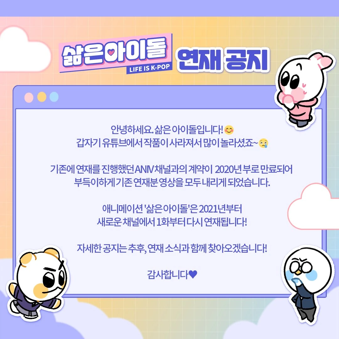 This Means: Hello, life is an idol! Suddenly, the work disappeared from YouTube, so I was very surprised~ The contract with the ANIV channel that was previously serialized has expired in 2020. Inevitably, all of the existing series were released. The animation ''Life Is K-POP'' will start in 2021 It will be serialized again from Episode 1 on the new channel! More notices will come with the news of the series in the future! Thank you.