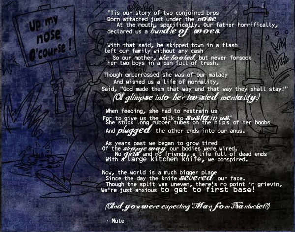 Mute and Motormouth in: Birth Of Abomination is an animated short film created by Jeffery Perlmutter (AKA Jeff Pee) a Clasky Csupo veteran, and Chris Graham (AKA Christopher Graphenberg) that aired in Spike And Mike's Sick and Twisted Festival Of Animation in the year 2000. It is about two siamese twin brothers named Mute and Motormouth, One is silent and the other is a complete chatterbox and they have finally been separated after being hidden from the world for 30 years. They go on a pizza delivery together which leads to a dark alleyway as they find a crack addicted whore named Crackho in the alleyway and see her giving live birth, also eating pizza and both Mute and Motormouth get boners while watching her and Motormouth get a blowjob from Crackho. It's a really inappropriate film that's meant to gross you and other people out. The film would receive positive reviews from audiences claiming that it was a very surreal and creative film and was a moderately popular contender at the festival with fans, even making the front cover in a flyer, but the film wasn't popular enough to get a sequel and it didn't 't age well with fans of the festival because the jokes would go over some a lot of peoples head or are very vulgar and crude for audiences, even in the early 2000's which this film was released, causing it to fade into obscurity. But However, the film would go on and gain a small cult following of people with some fans looking for the film online and want to watch the film someday.