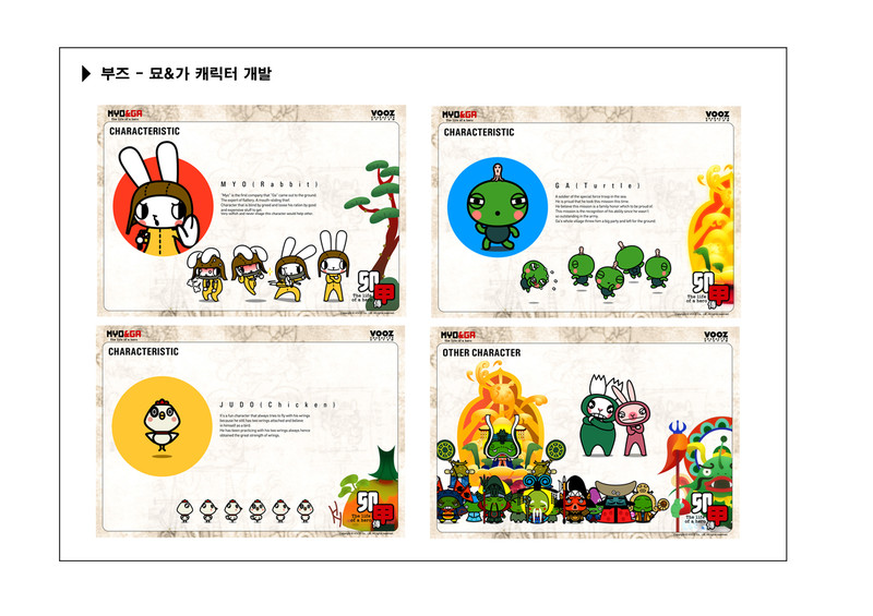 The Myo & Ga Club website included character profiles for Myo (who is designed after Bruce Lee), Ga, Kku (later Kuu/Co) and Auryong, the dragon fish.[31]