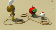 - Episode Synopsis: One day, Myo, Ga, and Kuu find a grape vine. Climbing up the tree to eat the grapes, the friends fight with each other to eat the grapes, but Ga loses his balance and falls off the tree. Luckily, his feet get tangled in the vine's trunk and he manages to avoid hitting the ground. But as he continues to gain momentum, he climbs up and down the tree, and Myo and Kuu, who are watching, think it's hilarious and tie ropes to their own feet to jump down. After discovering the fun of bungee jumping, the friends moved from the tree to the bridge to a dizzyingly high cliff, but there was nowhere to tie the rope to the cliff, so Myo had an idea. They divided the rope into three parts, tied them to their bodies, and jumped from different directions. But as expected, their weight falls to one side, and they all fall into the forest together.[70]